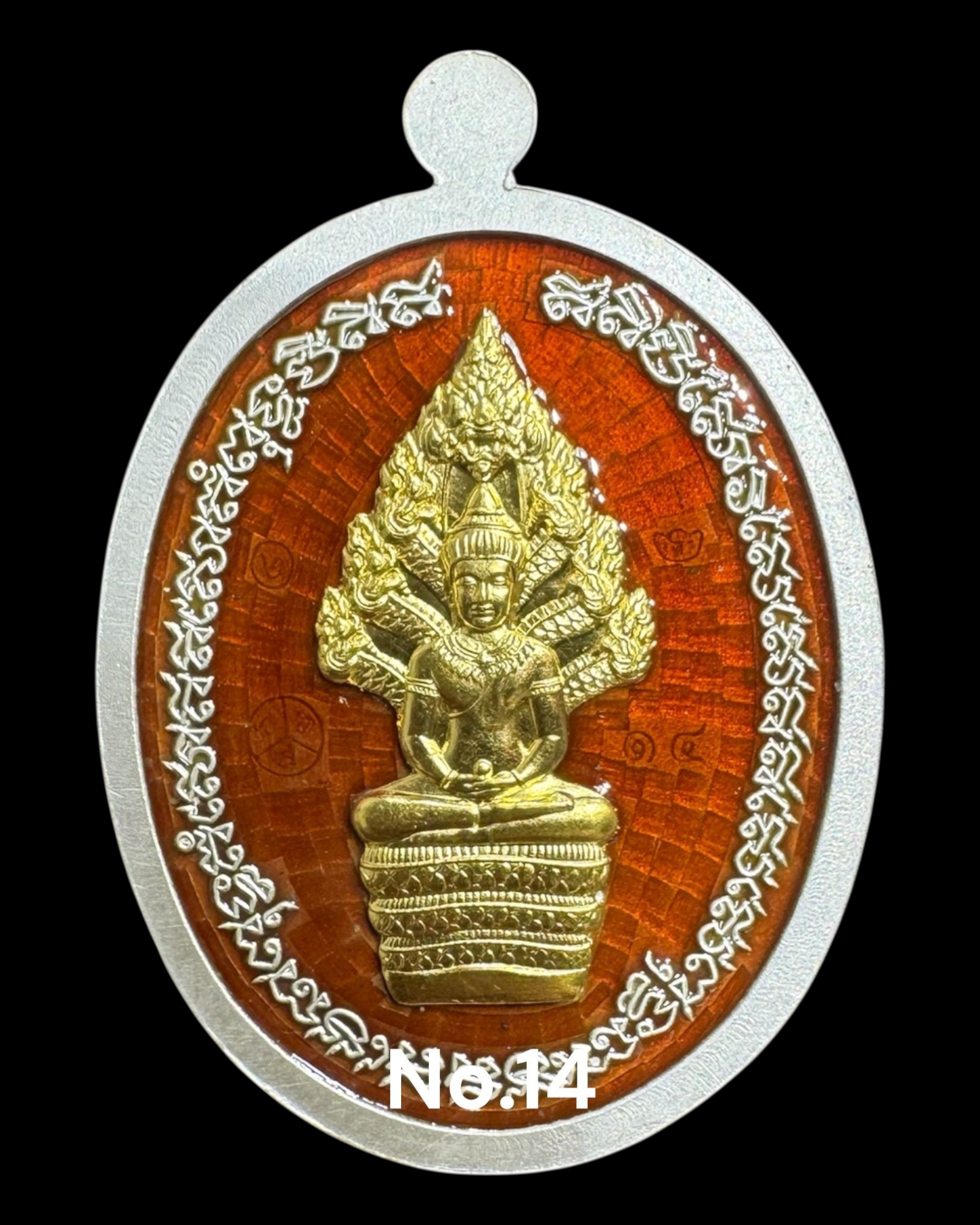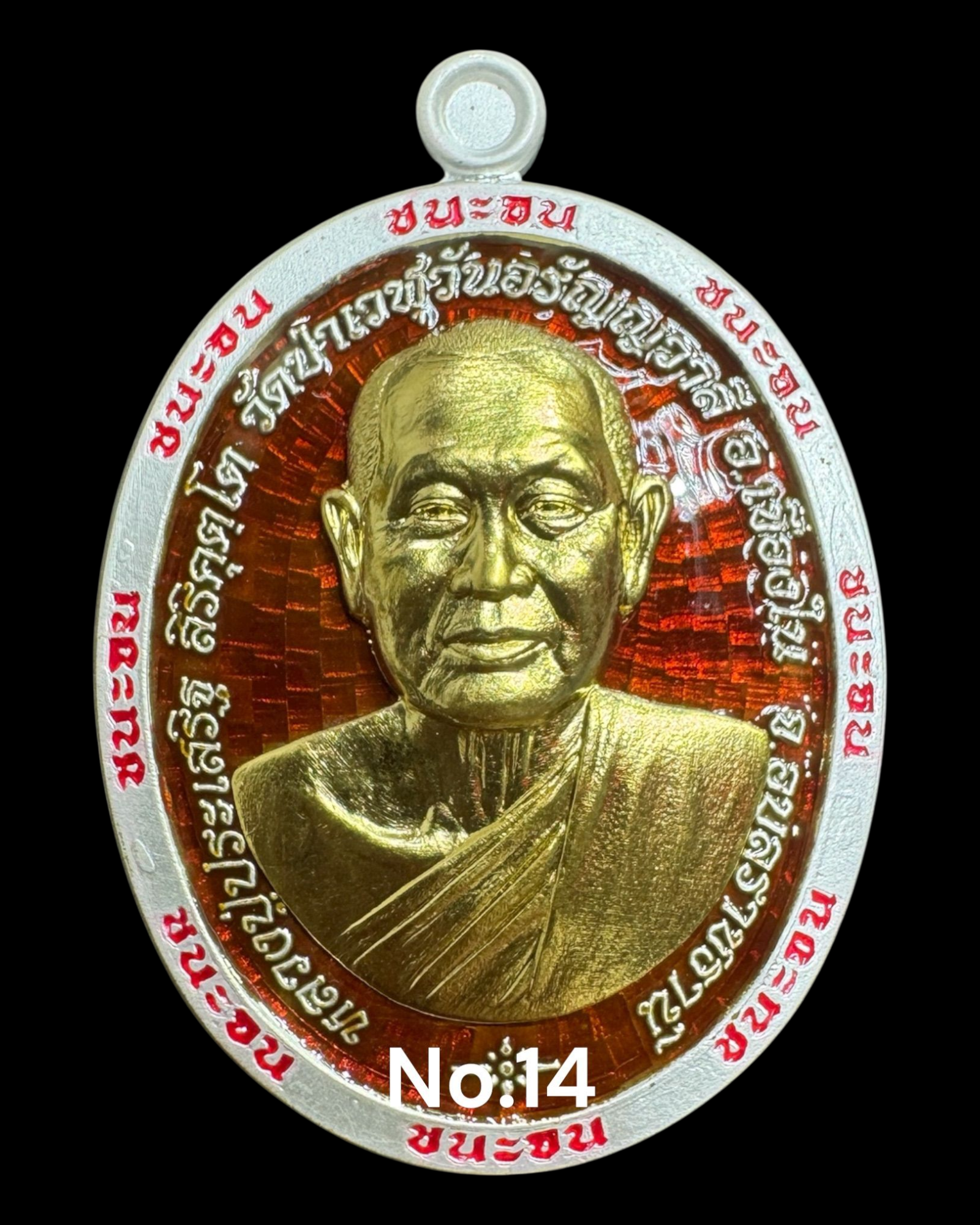 รุ่นชนะจน หลวงปู่ประเสริฐ สิริคุตโต เงินลงยาร้อน พื้นแดง หน้า-หลัง หน้ากากทองคำ หลังนาคปรกทองคำ สร้าง 19 เหรียญ เลข 14