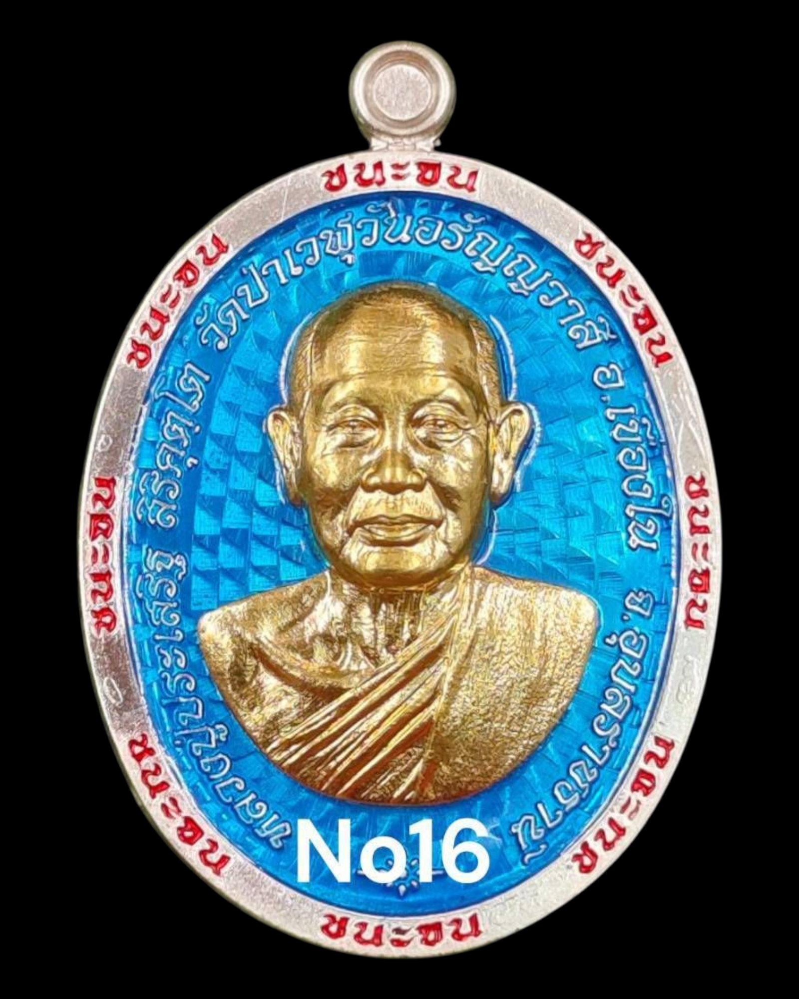 รุ่นชนะจน หลวงปู่ประเสริฐ สิริคุตโต : เงินขอบลงยาแดงพื้นลงยาฟ้าหน้าทองคำสร้าง 88 เหรียญเลข 16