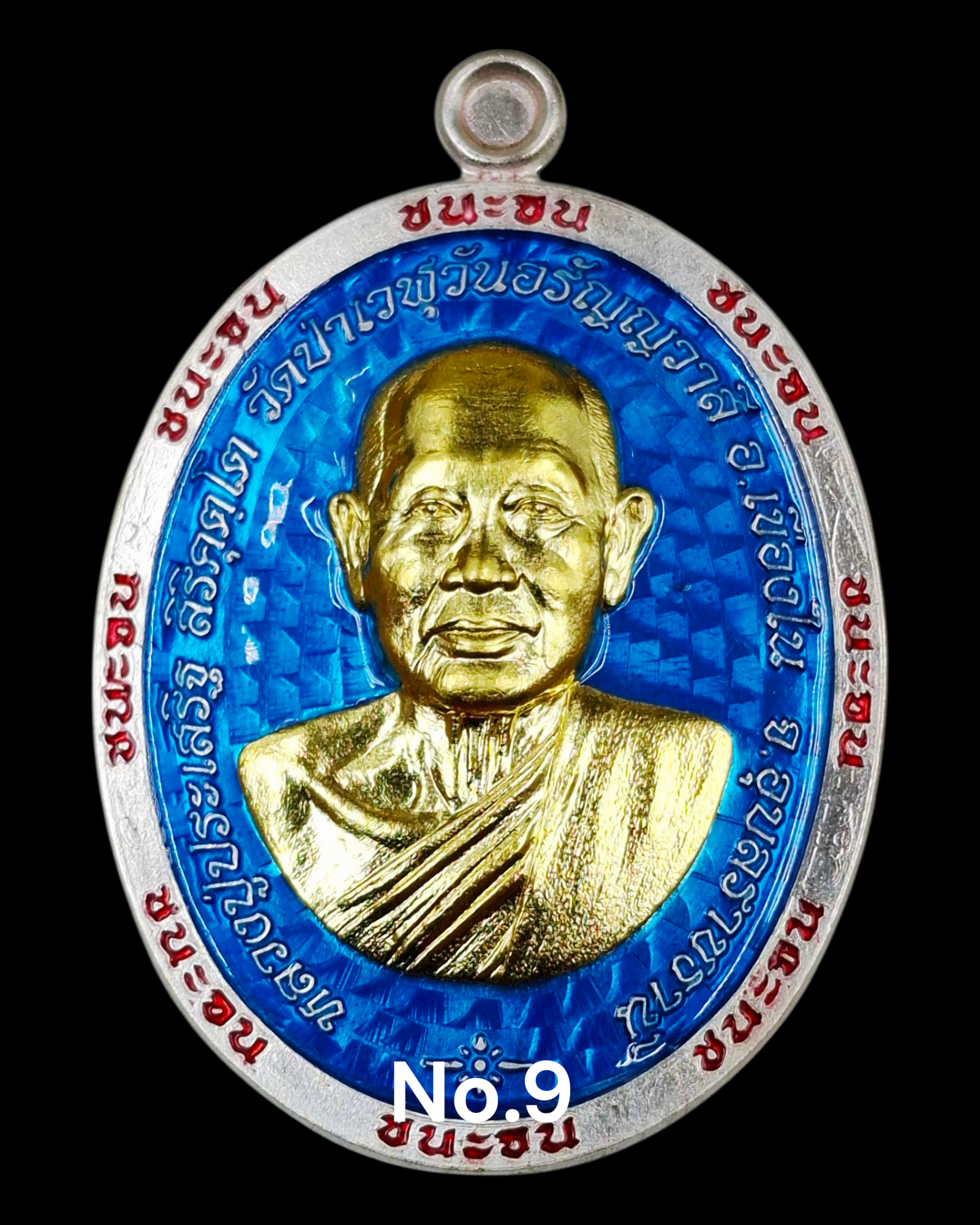 รุ่นชนะจน หลวงปู่ประเสริฐ สิริคุตโต : เงิน ขอบลงยาแดง พื้นลงยาฟ้า หน้าทองคำ สร้าง 88 เหรียญ เลข 9