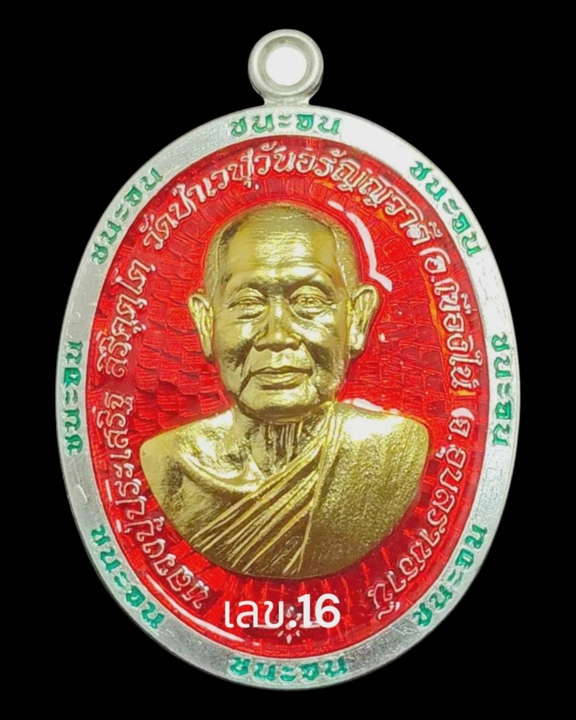 รุ่นชนะจน หลวงปู่ประเสริฐ สิริคุตโต : เงินลงยาขอบเขียวพื้นแดง หน้ากากทองคำ สร้าง 69 เหรียญ เลข.16