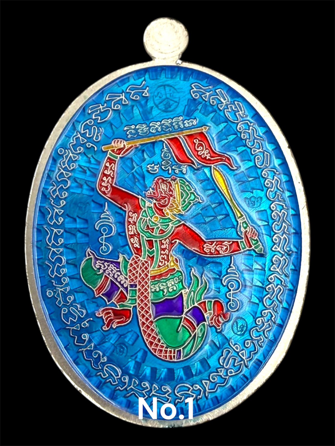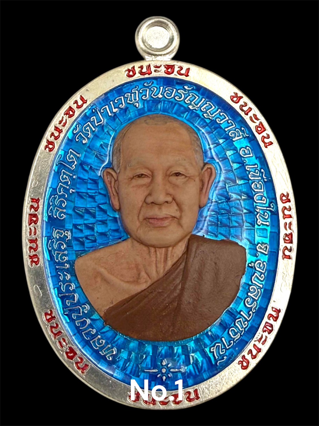 รุ่นชนะจน หลวงปู่ประเสริฐ สิริคุตโต : เงินลงยาพื้นฟ้า ขอบแดง หลังลงยาฟ้า หนุมานลงยา หน้ากากเพ้นท์ สร้าง 9 เหรียญ เลข 1)