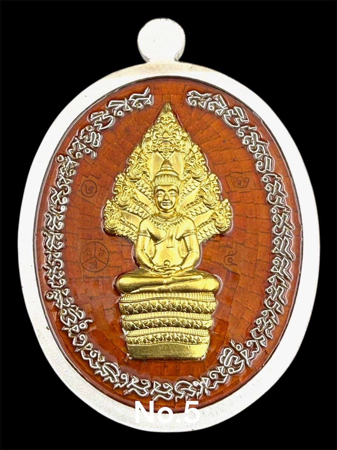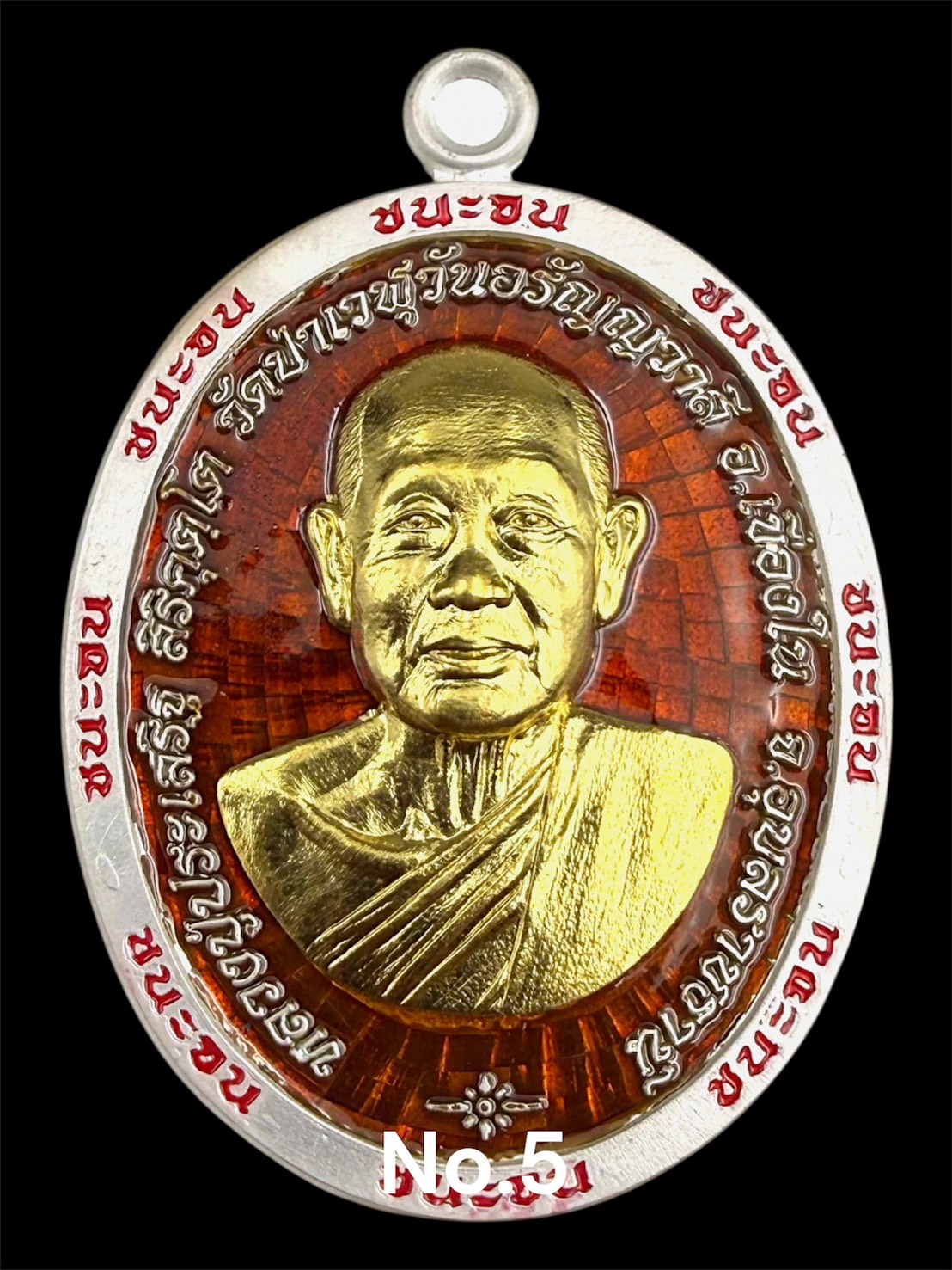 รุ่นชนะจน หลวงปู่ประเสริฐ สิริคุตโต : เงินหน้ากากทองคำ ลงยาร้อน พื้นแดงหน้าหลัง -หลังนาคปรกทองคำ สร้าง 19 เหรียญ เลข.5
