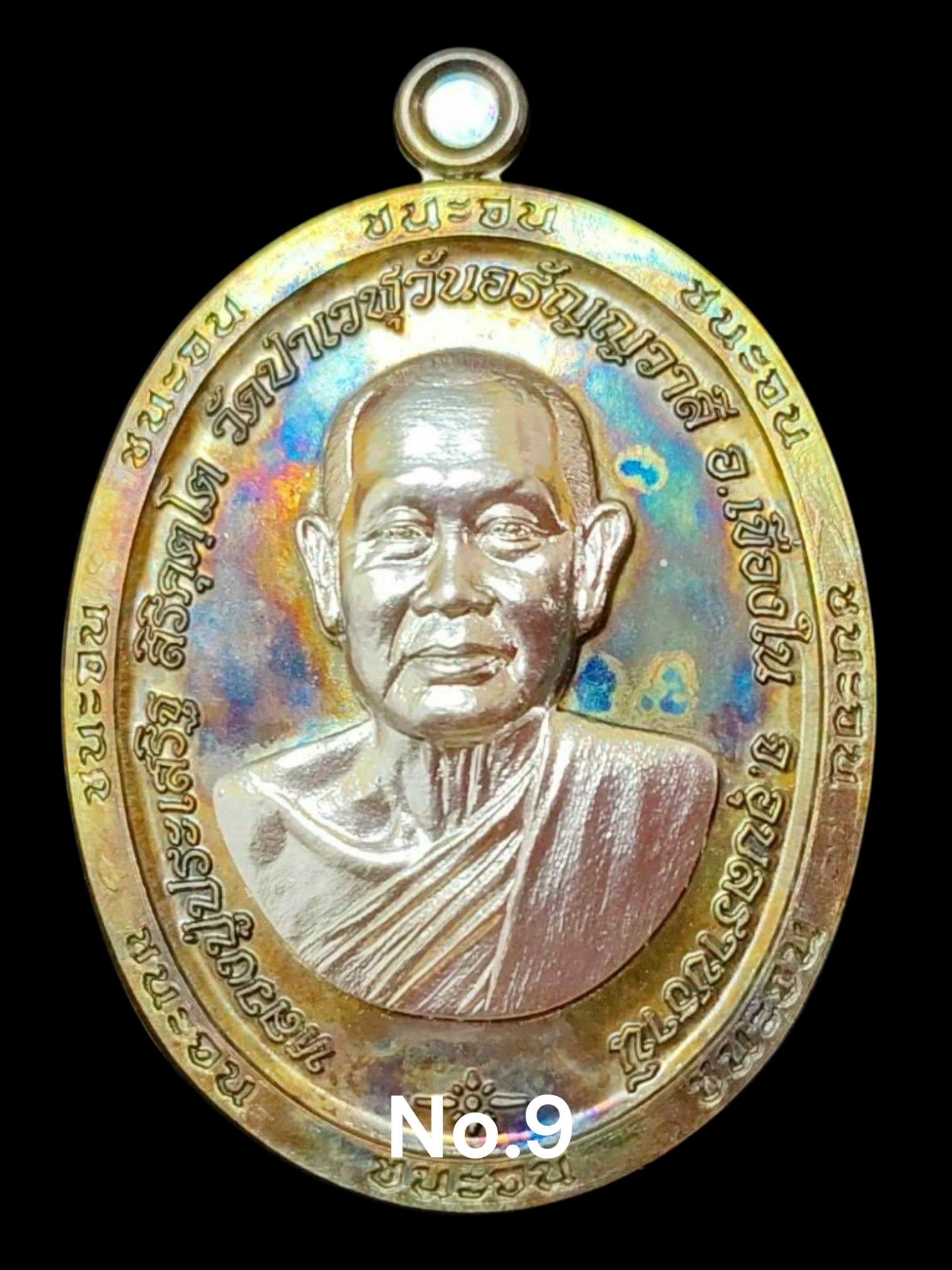 รุ่นชนะจน หลวงปู่ประเสริฐ สิริคุตโต : T.3 นวะอุดผงพุทโธน้อย /เกศา หน้ากากชุบทองคำขาวสร้าง 99 เหรียญ เลข.9
