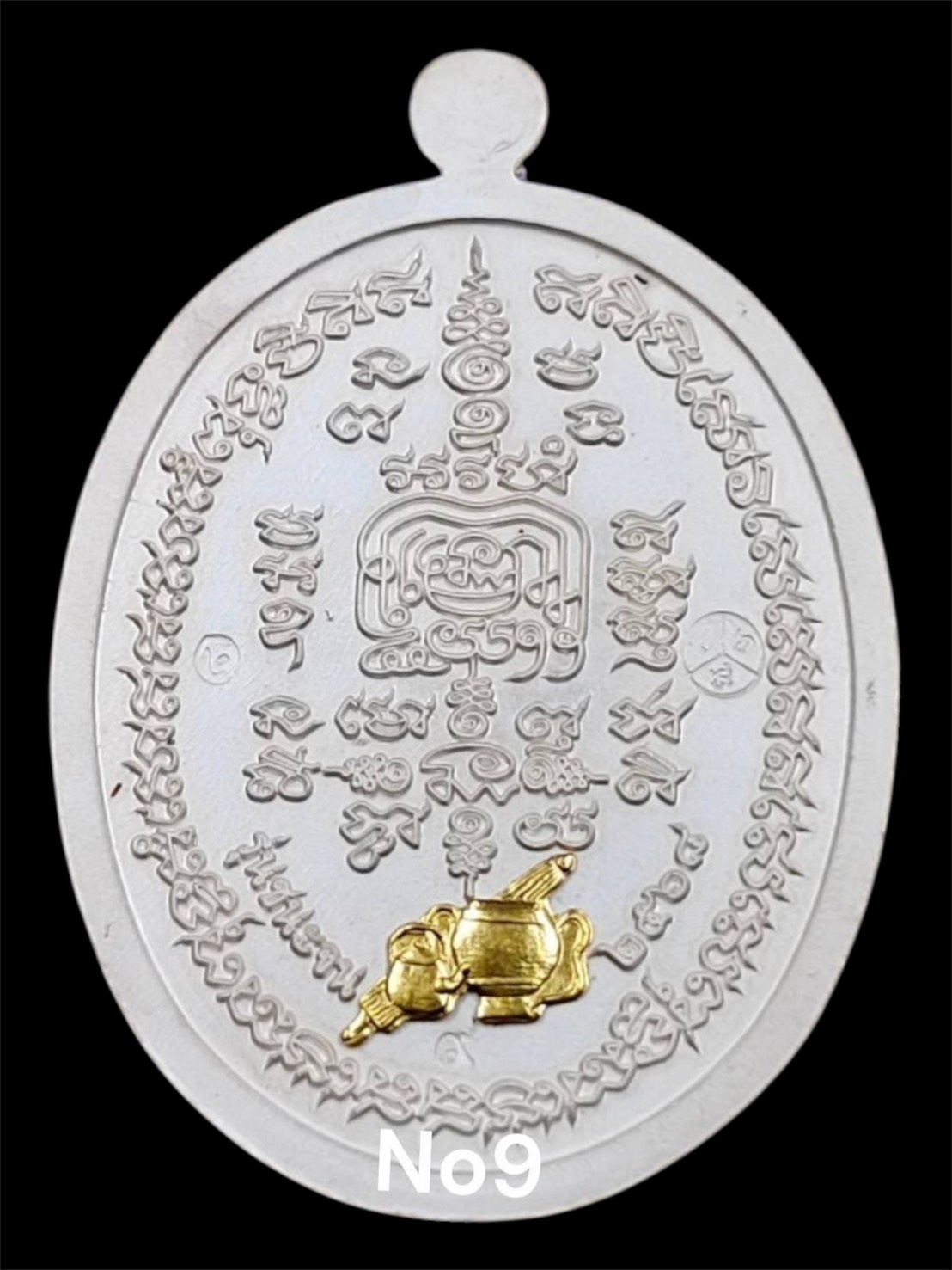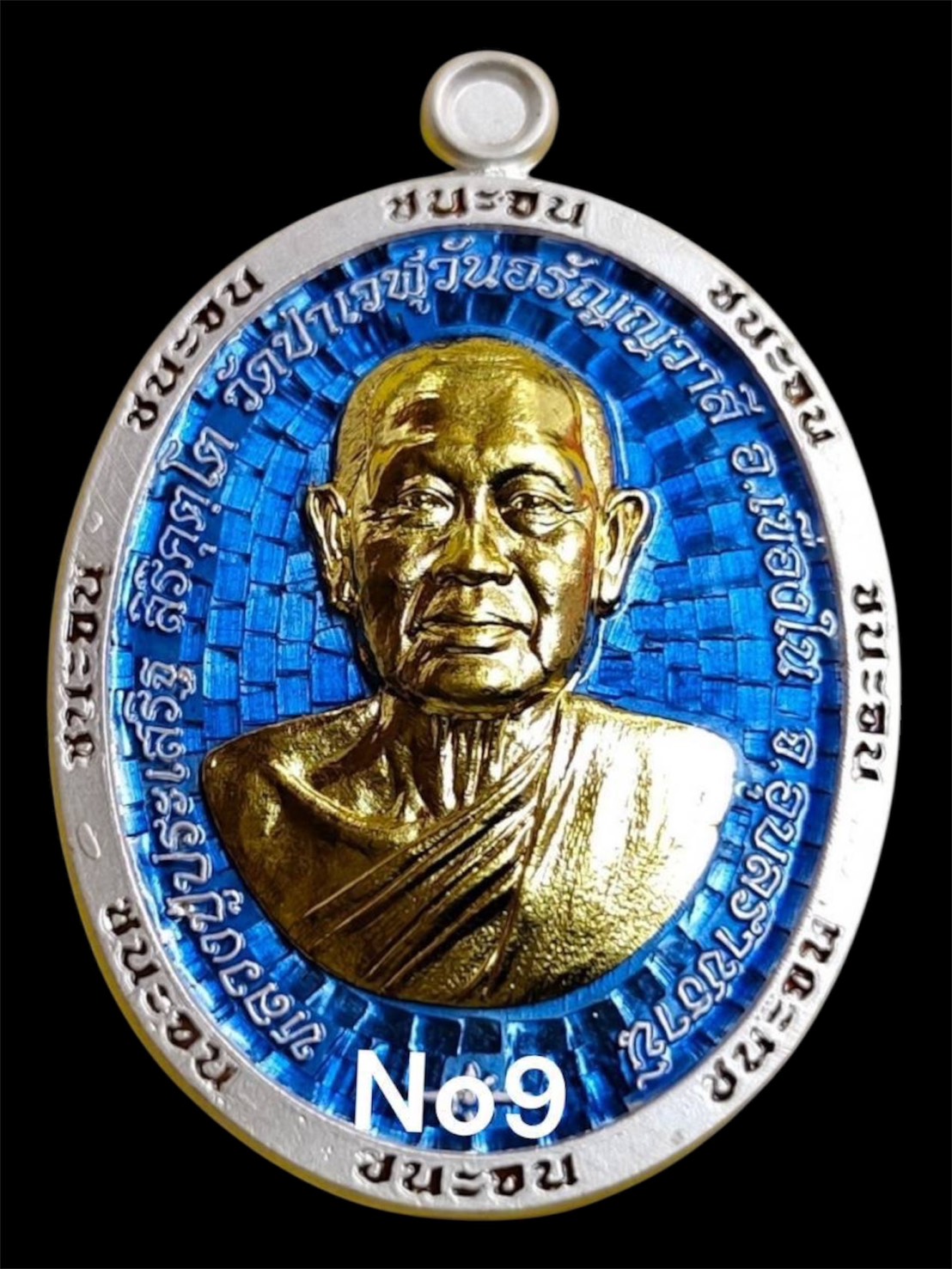 รุ่นชนะจน : เนื้อเงินลงยาร้อนตัวหนังสือแดงพื้นน้ำเงินหน้าทองคำหลังบาตรทองคำสร้าง 55 เหรียญเลข 9